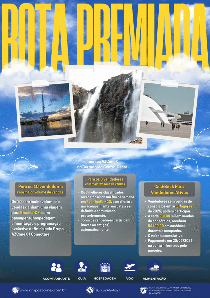 Começou, dia 01 de outubro, a campanha “Rota Premiada” das empresas AZConex e da Conectare Soluções LTDA, onde serão feitas duas premiações: os dez vendedores com maior volume de vendas ganharão uma viagem para Brasília-DF com tudo incluso, e os três primeiros colocados entre os 10, também ganharão um final de semana para Pirenópolis-GO com direito a acompanhante. A vigência será dia 31 de dezembro de 2025 e a apuração será anunciada dia 20 de fevereiro de 2026, sendo consideradas para premiação apenas os participantes que cumprirem todos os critérios estabelecidos pelo Regulamento Oficial da Campanha Rota Premiada – Consórcios Grupo AZConeX / Conectare.